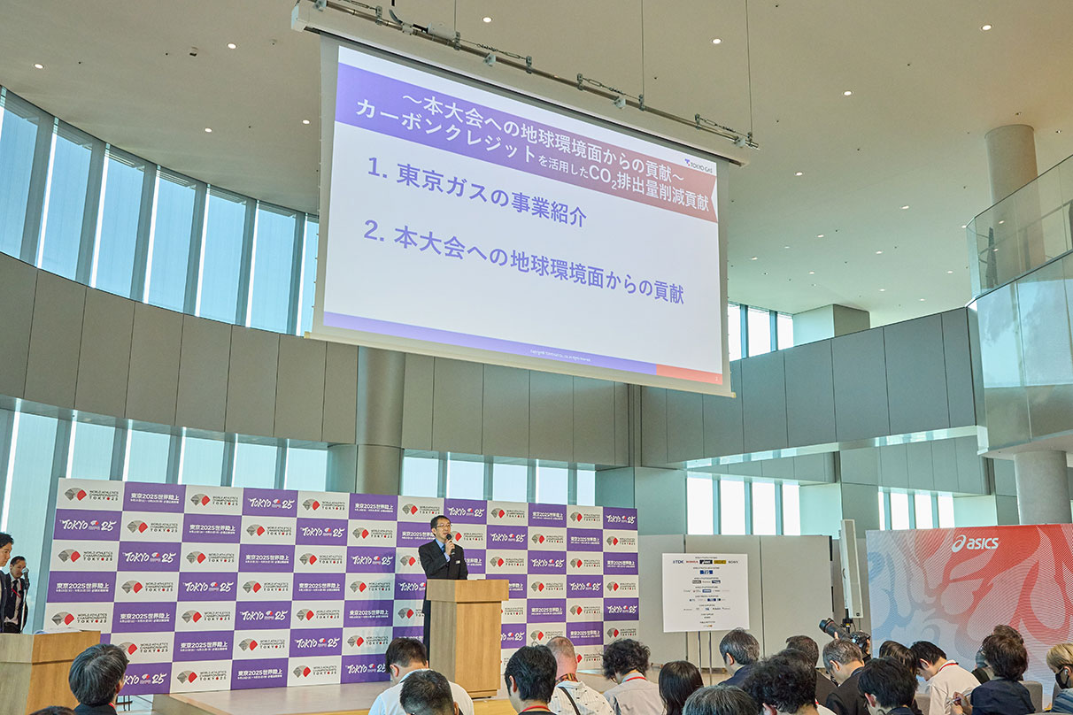まず、『東京2025世界陸上100 Days To Go!』の開催に尽力された皆さまに、心より感謝と敬意を申し上げます。本日は、東京ガスが本大会にどのように環境面から貢献するのか、特に『カーボンクレジットを活用したCO2排出量削減』についてご説明いたします。